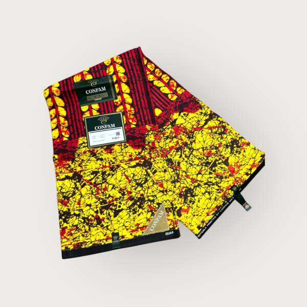 Ignite your fashion with this vibrant Confam wax print featuring a fiery blend of red, yellow, and black patterns. Perfect for those who love bold, energetic African styles.