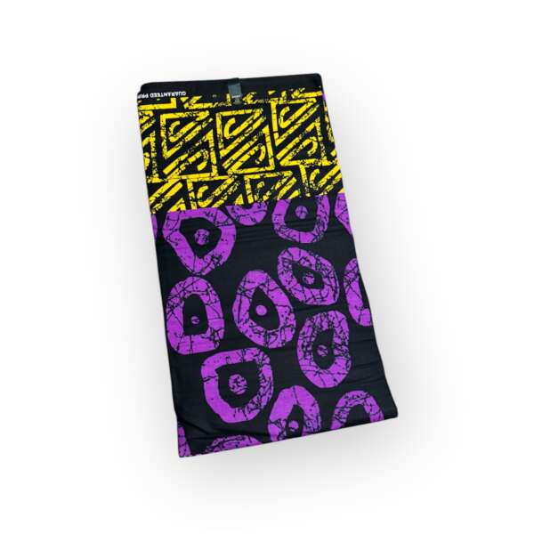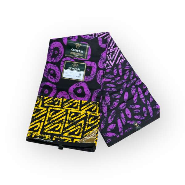 Vivid, fierce, and undeniably regal. This 6-yard CONFAM wax print blends deep purple and bold yellow abstract patterns on black for a standout African fashion statement.