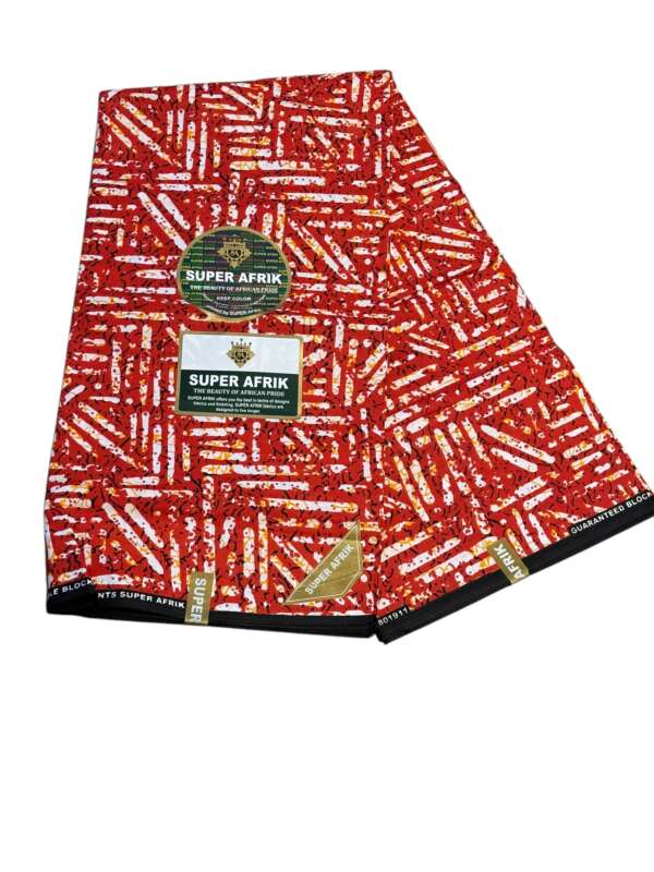 Sunfire Maze is a bold, energetic wax print from the Super Afrik collection — a tribute to the beauty of African pride. With a vibrant pattern of interlocking gold, white, and red linear motifs, this fabric makes a fierce and fashionable statement. The fiery tones symbolize strength, unity, and vibrance, perfect for turning heads at weddings, parties, and cultural events.